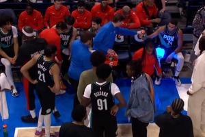 GIF-杨瀚森和阿夫迪亚主动沟通 不过后者似乎有些没懂 喊了翻译过来之后听懂 随后和杨瀚森碰拳