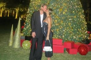 在圣诞树下迪莱塔·莱奥塔与卡里乌斯甜蜜亲吻,图中可以看到迪莱塔·莱奥塔的小腹隆起明显。本月卡里乌斯妻子宣布已怀上二胎,两人将迎来第二个孩子。