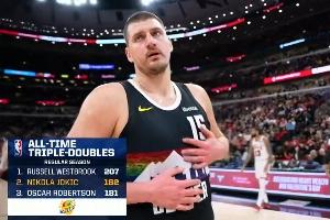 这是约基奇NBA生涯常规赛第182次三双,超越“大O”奥斯卡·罗伯特森,独占历史第二,榜首是威少(207次三双)。