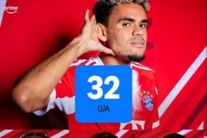根据统计,迪亚斯本赛季至今代表拜仁出场30次,打进18球助攻14次,直接参与进球32个。