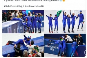 意大利短道速滑队夺得米兰冬奥会混合接力赛冠军,国米官方社媒转发新闻,并写道:“辉煌的蓝金之光 ,祝贺意大利短道速滑队在混合接力项目中勇夺桂冠,阿里安娜·丰塔纳创造历史,摘得个人第十二枚奥运奖牌!”