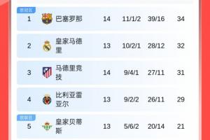 最新积分榜方面:先赛的巴萨凭借2分优势暂升榜首,排名第2的皇马明日凌晨将客战赫罗纳,同样先赛的马竞积分反超黄潜暂时来到第3。