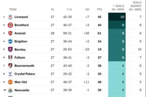体育资讯02月26日讯 TA统计了本赛季英超球队85分钟及以后的进球及丢球排行榜,其中利物浦以10球位列榜首,阿森纳8球位列第三。