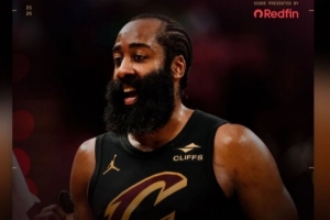 赛后哈登在INS上转发了骑士官方晒出的本场赢球海报,封面人物是自己。