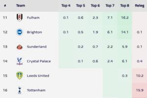 高降级区1分!英超各队降级概率:热刺升16%,狼队、伯恩利超99%
